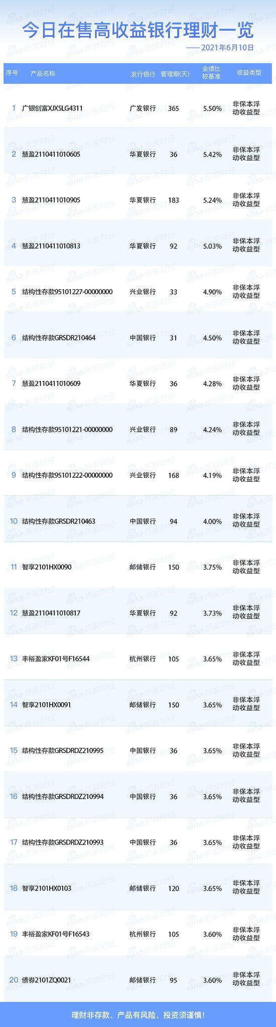 •   新浪财经6月10日在售高收益银行理财产品:今日业绩比较基准在5.0%以上的银行人民币理财产品共4款。广发银行的“广银创富XJXSLG4311”业绩比较基准最高,为5.50%。