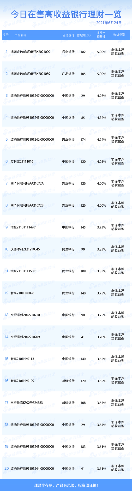 银行6月24日在售高收益理财产品