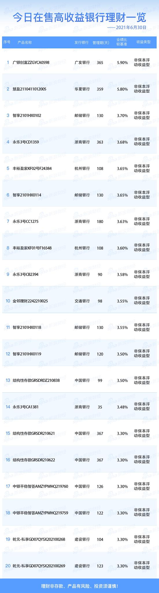 •   新浪财经6月30日在售高收益银行理财产品:今日业绩比较基准在3.6%以上的银行人民币理财产品共8款。广发银行的“广银创富ZZGYCA0598”业绩比较基准最高,为5.9%。
