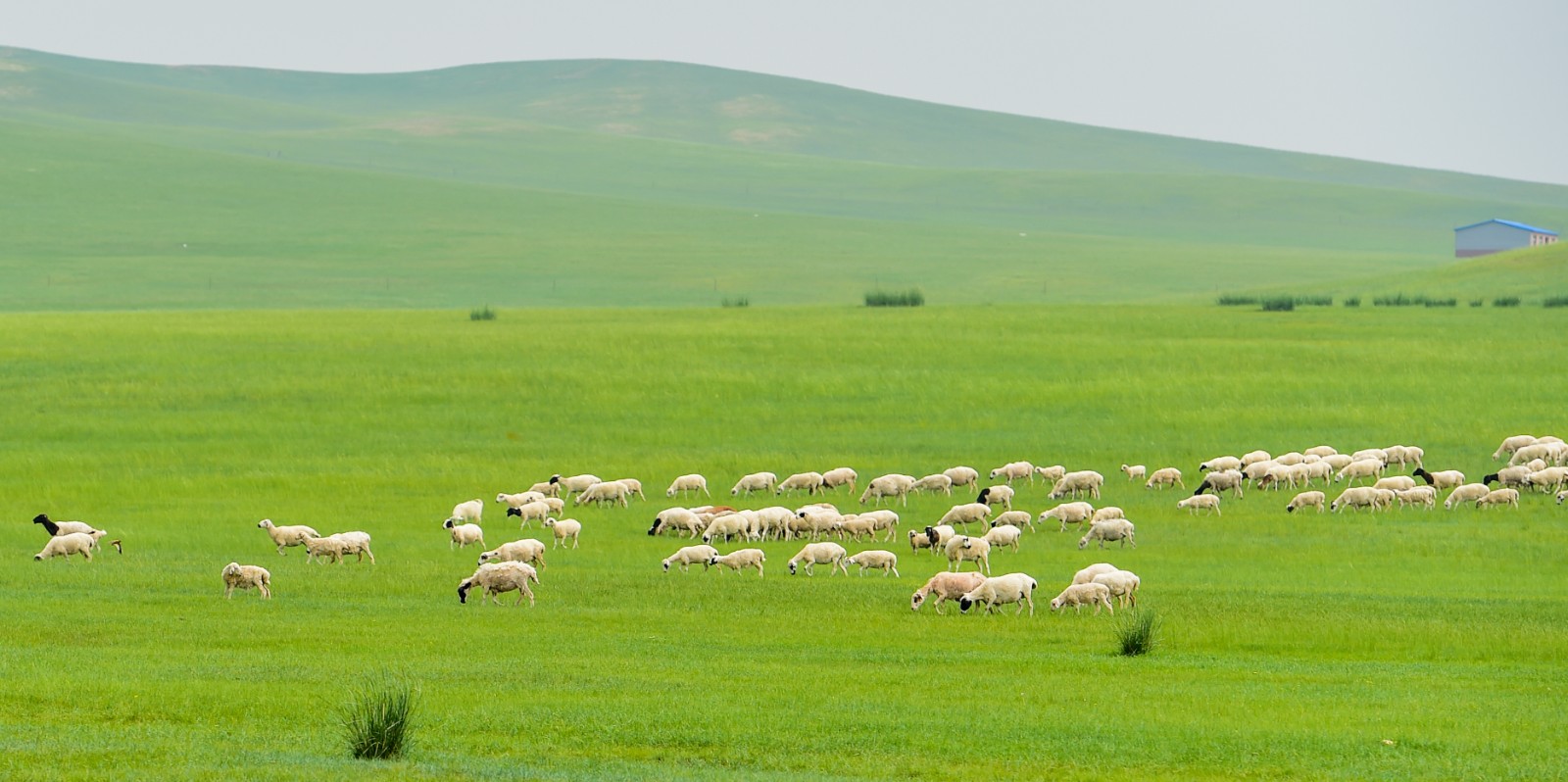 7月12日,羊群在锡林郭勒大草原上觅食。