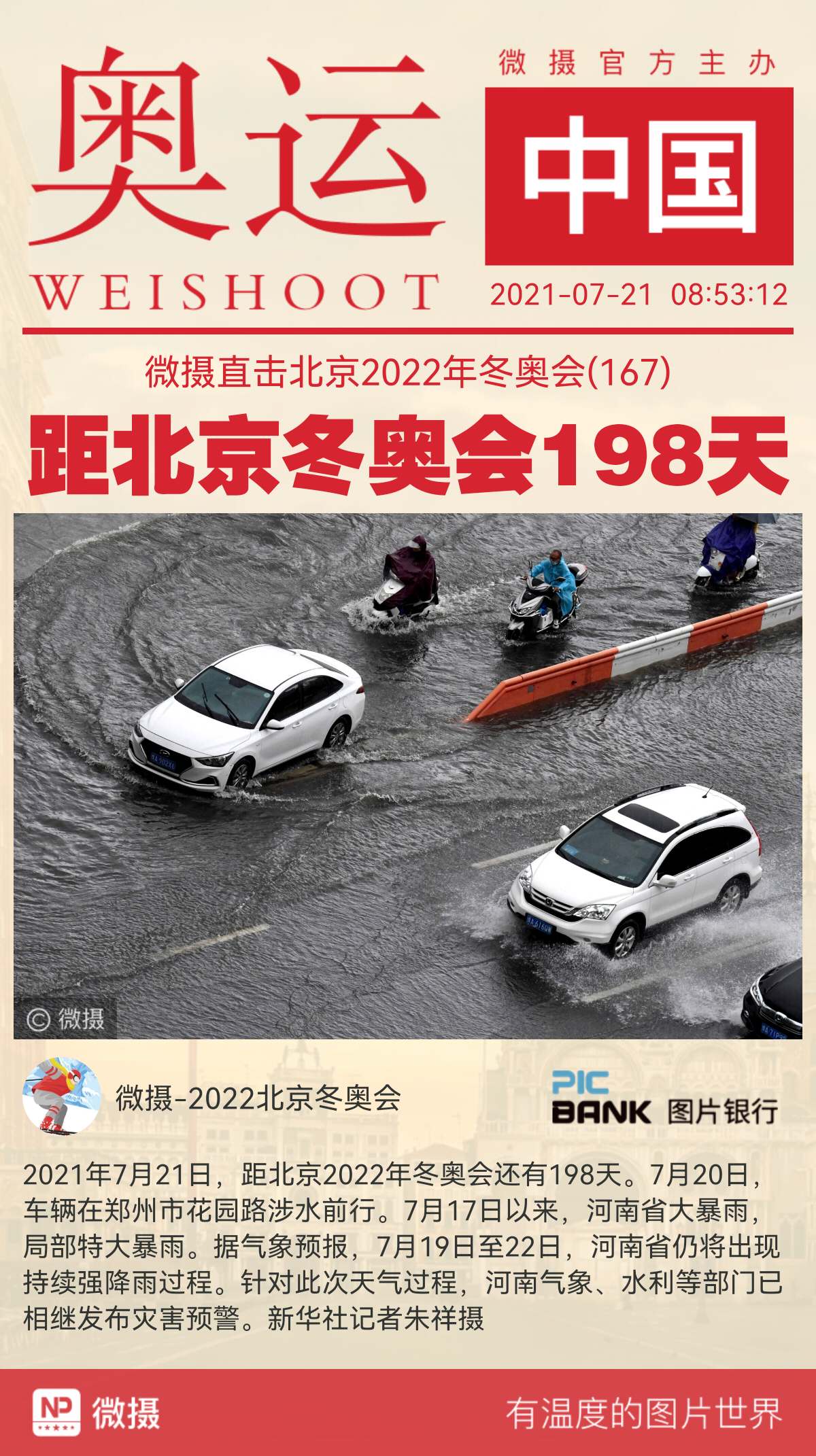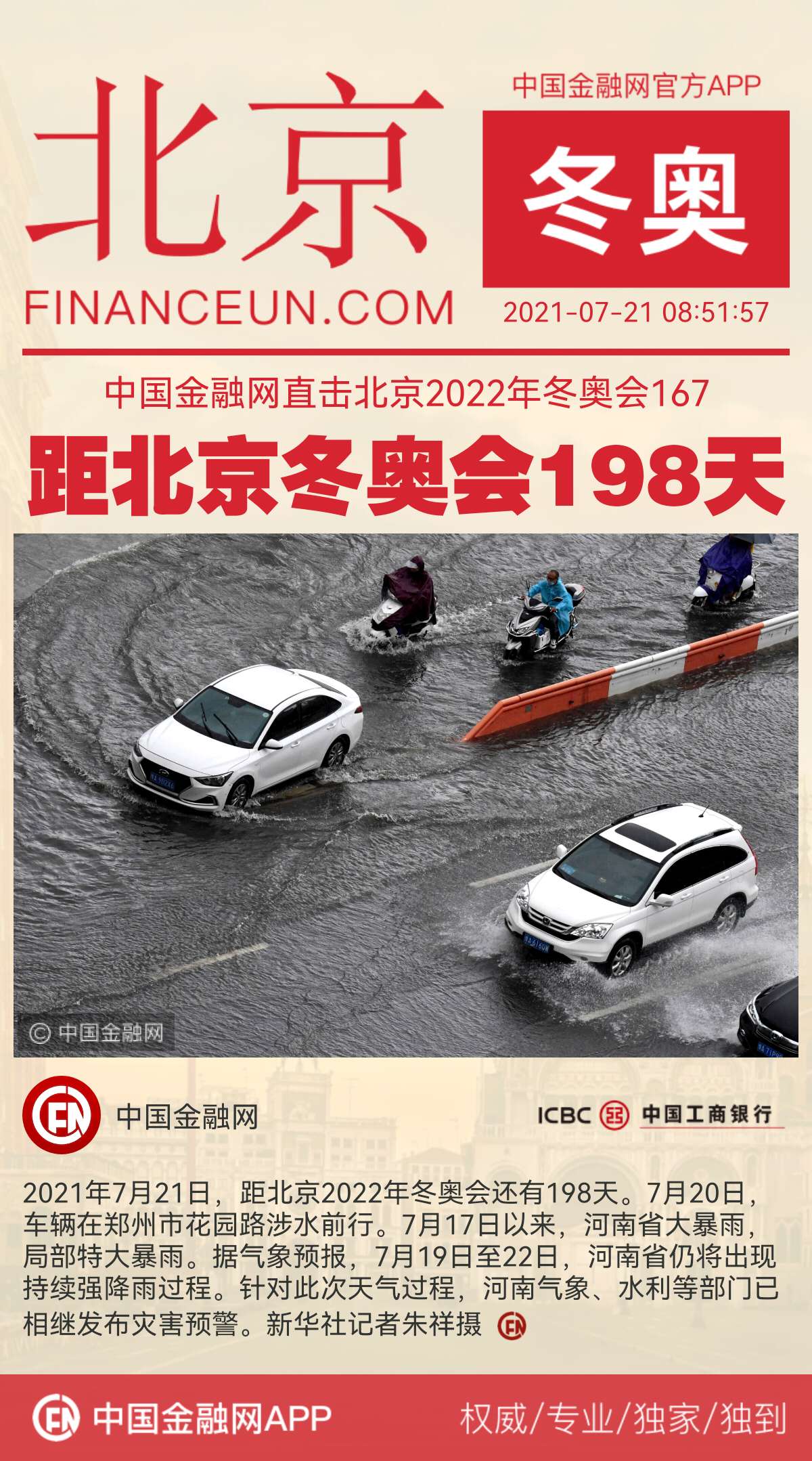 2021年7月21日,距北京2022年冬奥会还有198天。7月20日,车辆在郑州市花园路涉水前行。7月17日以来,河南省大暴雨,局部特大暴雨。据气象预报,7月19日至22日,河南省仍将出现持续强降雨过程。针对此次天气过程,河南气象、水利等部门已相继发布灾害预警。