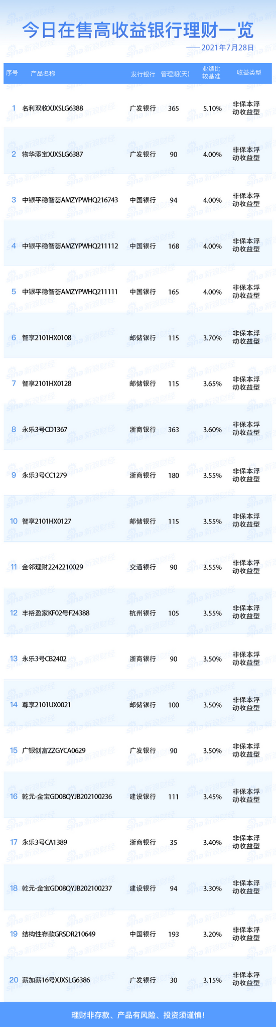 •   新浪财经7月27日在售高收益银行理财产品:今日业绩比较基准在4.00%以上的银行人民币理财产品共5款。广发银行的“名利双收XJXSLG6388”业绩比较基准最高,为5.10%。