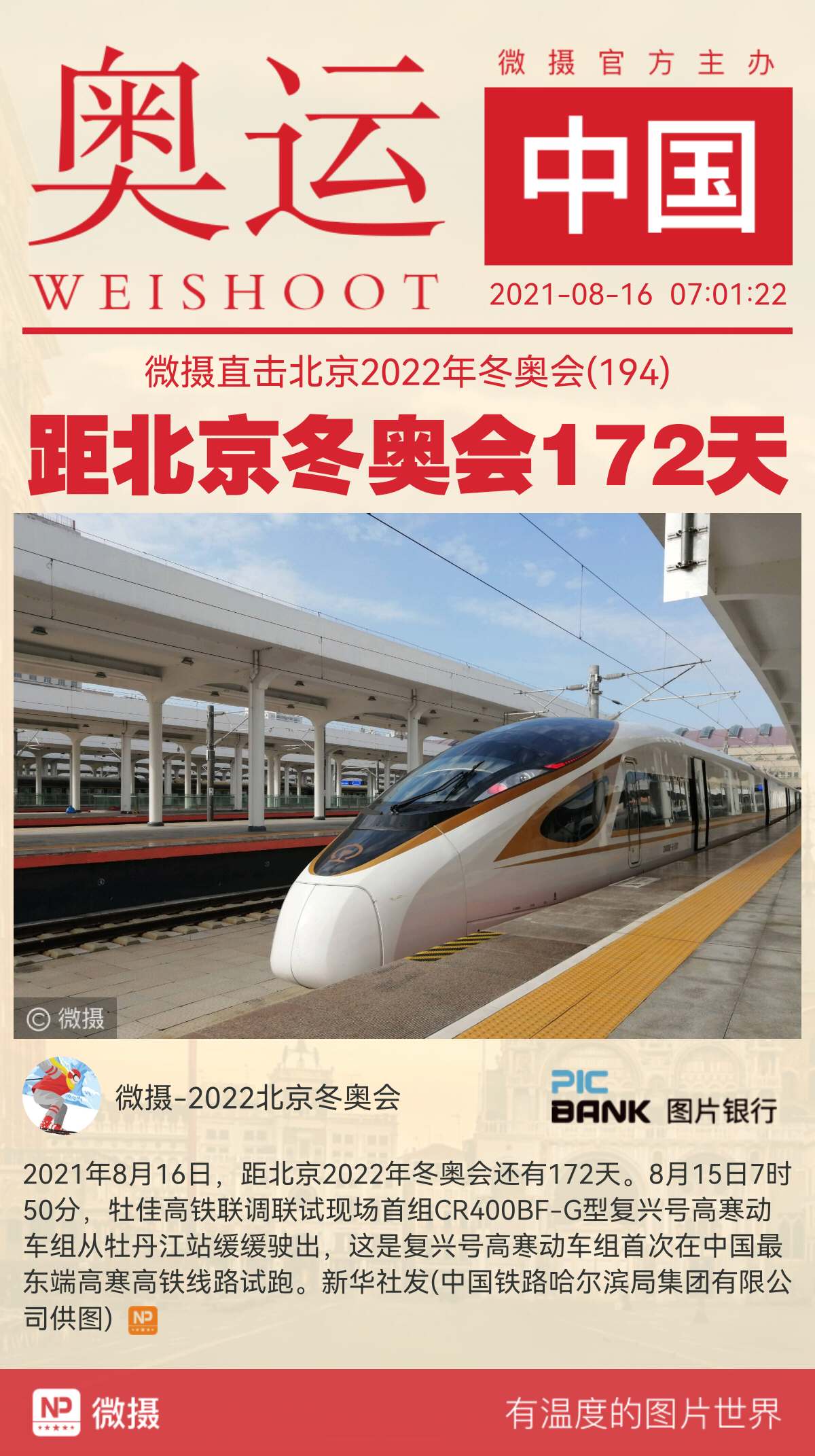 2021年8月16日,距北京2022年冬奥会还有172天。8月15日7时50分,牡佳高铁联调联试现场首组CR400BF-G型复兴号高寒动车组从牡丹江站缓缓驶出,这是复兴号高寒动车组首次在中国最东端高寒高铁线路试跑。