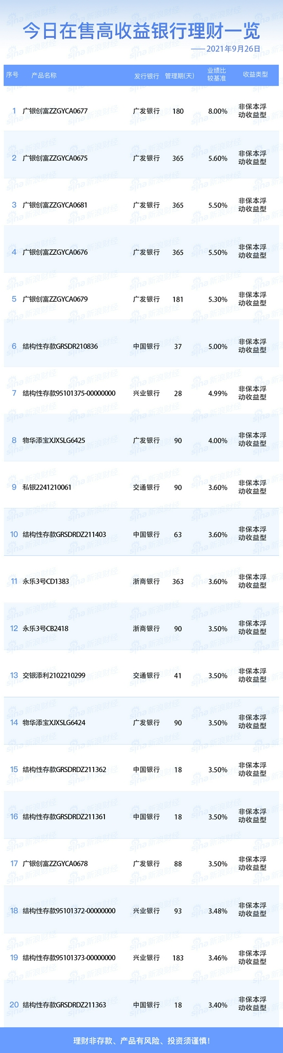 •   新浪财经9月26日在售高收益银行理财产品:今日业绩比较基准在4.9%以上的银行人民币理财产品共7款。广发银行 的“ 广银创富ZZGYCA0677”业绩比较基准最高,为8.00%。