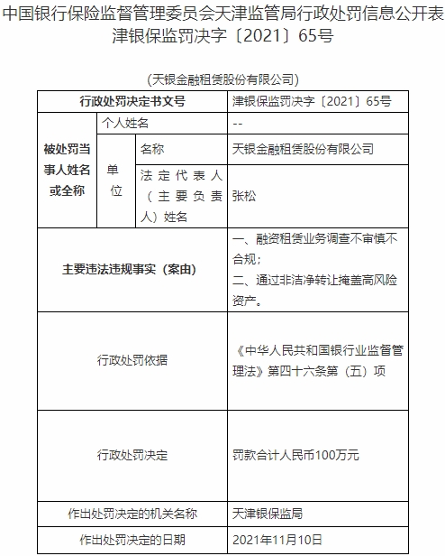 •   中国经济网北京11月23日讯 银保监会网站日前发布中国银行保险监督管理委员会天津监管局行政处罚信息公开表(津银保监罚决字〔2021〕65号、66号)显示,天银金融租赁股份有限公司(以下简称“天银金融租赁”)存在融资租赁业务调查不审慎不合规、通过非洁净转让掩盖高风险资产两项违法违规事实,天津银保监局对其罚款合计人民币100万元,行政处罚依据为《中华人民共和国银行业监督管理法》第四十六条第(五)项。