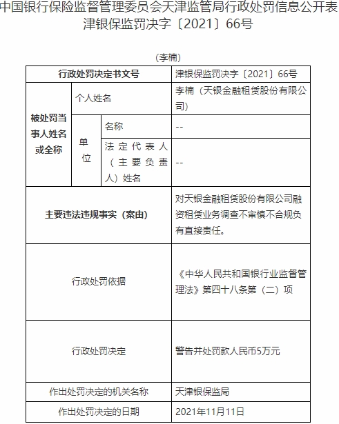 李楠对天银金融租赁融资租赁业务调查不审慎不合规负有直接责任。天津银保监局对其警告并处罚款人民币5万元,行政处罚依据为《中华人民共和国银行业监督管理法》第四十八条第(二)项。