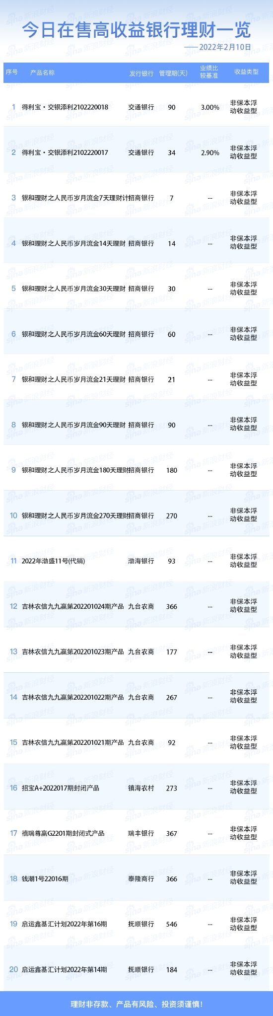 •   新浪财经2月10日在售高收益银行理财产品一览:今日业绩比较基准在2.90%及以上的银行人民币理财产品共2款。理财非存款、产品有风险、投资须谨慎!