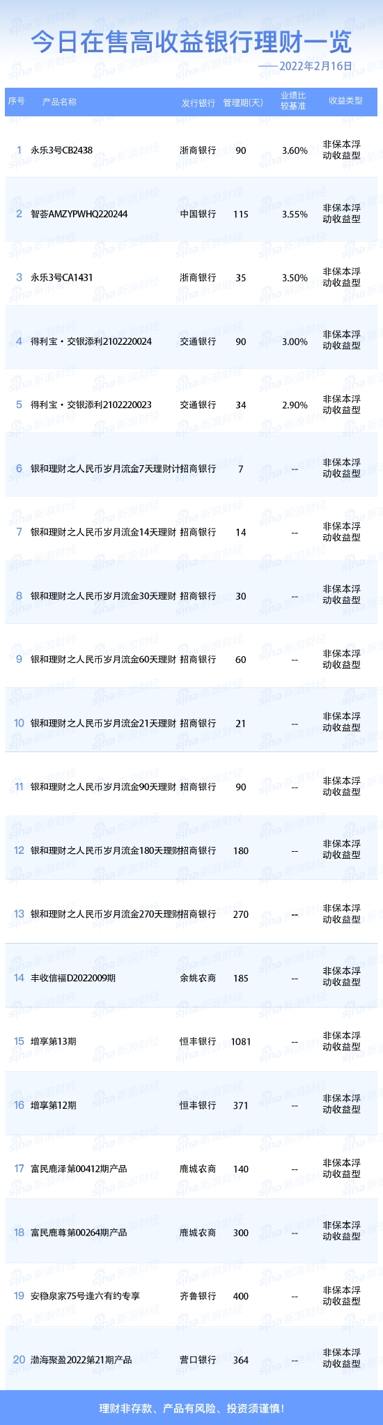 •   新浪财经2月16日在售高收益银行理财产品一览:今日业绩比较基准在2.90%及以上的银行人民币理财产品共5款。理财非存款、产品有风险、投资须谨慎!