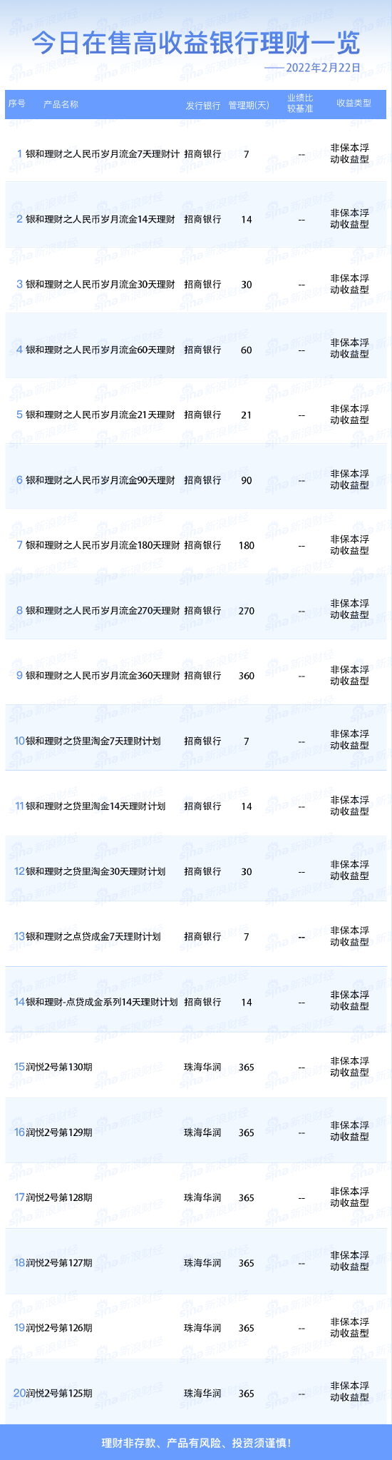 •   新浪财经2月22日在售高收益银行理财产品一览。理财非存款、产品有风险、投资须谨慎!