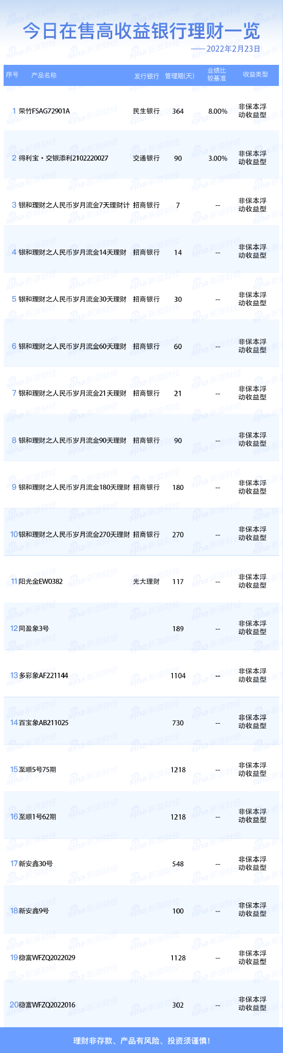 •   新浪财经2月23日在售高收益银行理财产品一览。理财非存款、产品有风险、投资须谨慎!