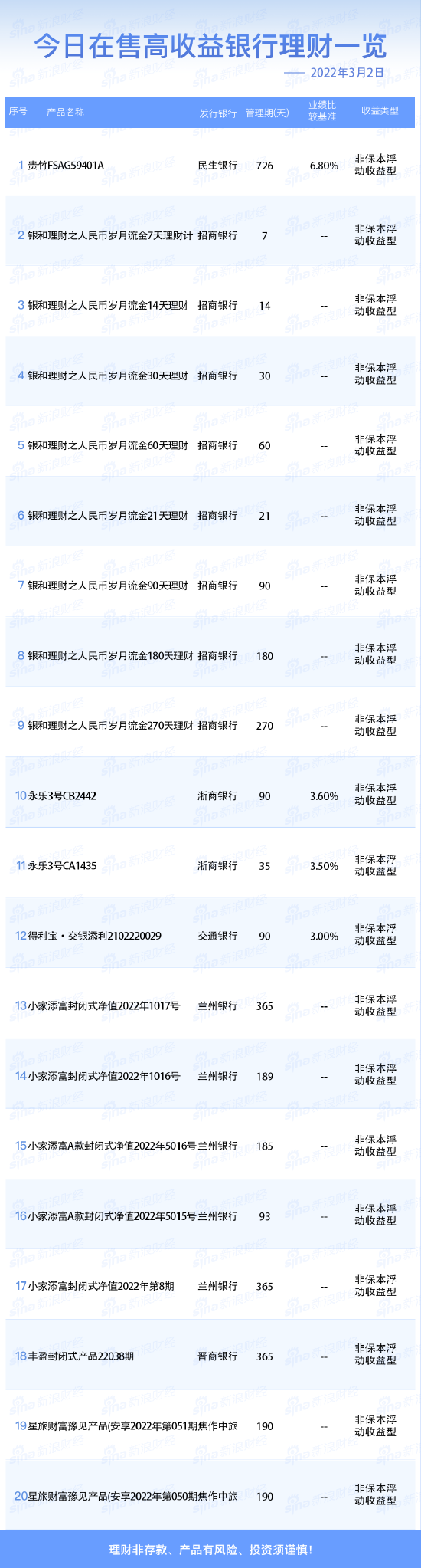 •   新浪财经3月2日在售高收益银行理财产品一览。今日业绩比较基准在3.00%及以上的银行人民币理财产品共4款。理财非存款、产品有风险、投资须谨慎!