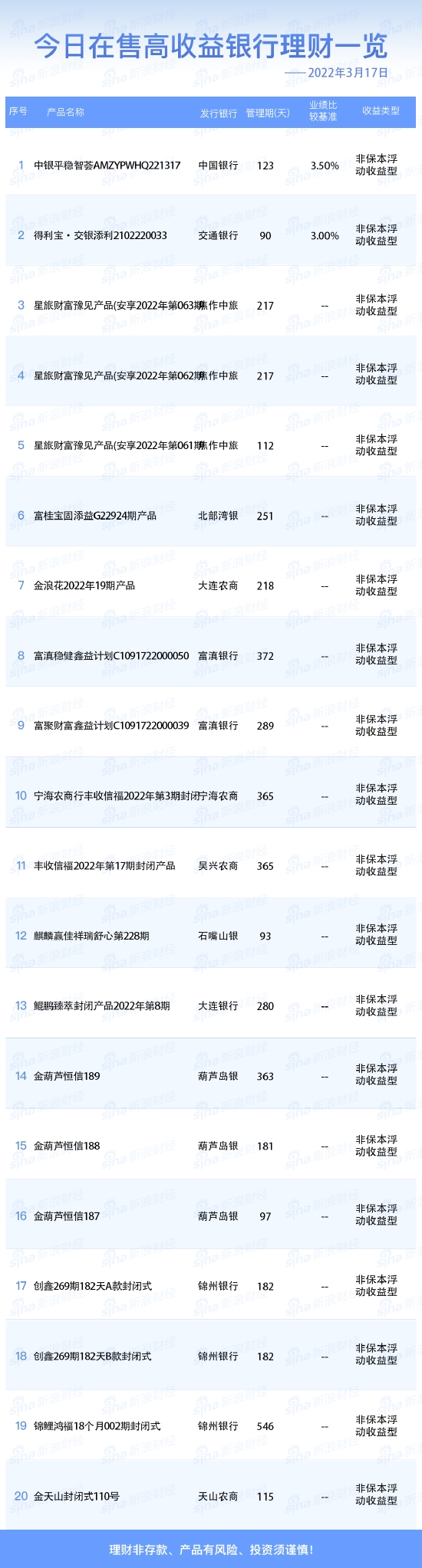 •   新浪财经3月17日在售高收益银行理财产品一览。今日业绩比较基准在3.00%及以上的银行人民币理财产品共2款。理财非存款、产品有风险、投资须谨慎!