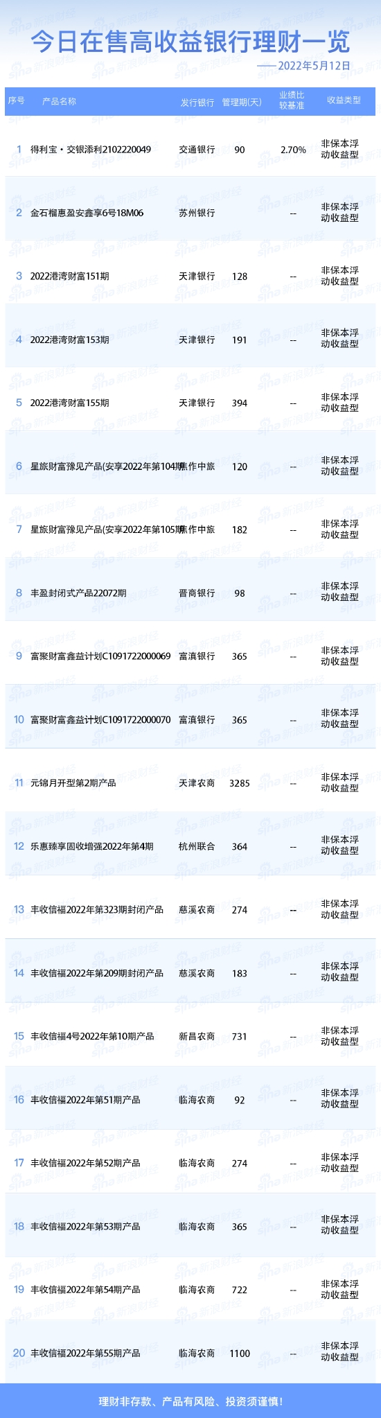 •   新浪财经5月12日在售高收益银行理财产品一览。今日业绩比较基准在2.70%及以上的银行人民币理财产品共1款。理财非存款、产品有风险、投资须谨慎!