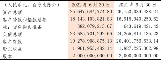 截至2022年6月30日,辽宁振兴银行资产总额256.48亿元,去年同期为261.53亿元;客户贷款和垫款总额181.43亿元,去年同期为169.16亿元;负债总额236.86亿元,去年同期为242.66亿元;客户存款192.79亿元,去年同期为204.02亿元。