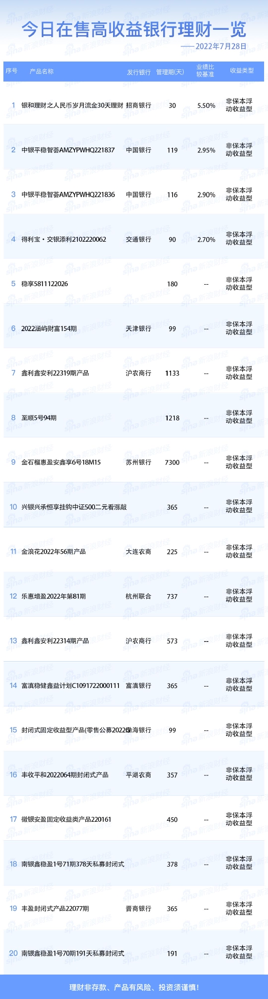 •   新浪财经7月28日在售高收益银行理财产品一览。今日业绩比较基准在2.70%及以上的银行人民币理财产品共4款。理财非存款、产品有风险、投资须谨慎!