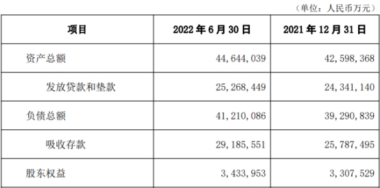 截至2022年6月30日,华融湘江银行的资产总额4464.40亿元,上年末为4259.84亿元;发放贷款和垫款2526.84亿元,上年末为2434.11亿元;负债总额4121.01亿元,上年末为3929.08亿元;吸收存款2918.56亿元,上年末为2578.75亿元。