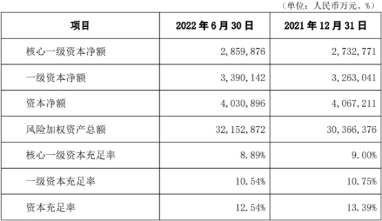 今年上半年,华融湘江银行的资本充足率指标下滑。截至2022年6月30日,华融湘江银行的资本充足率为12.54%,上年末为13.39%;一级资本充足率为10.54%,上年末为10.75%;核心一级资本充足率为8.89%,上年末为9.00%。