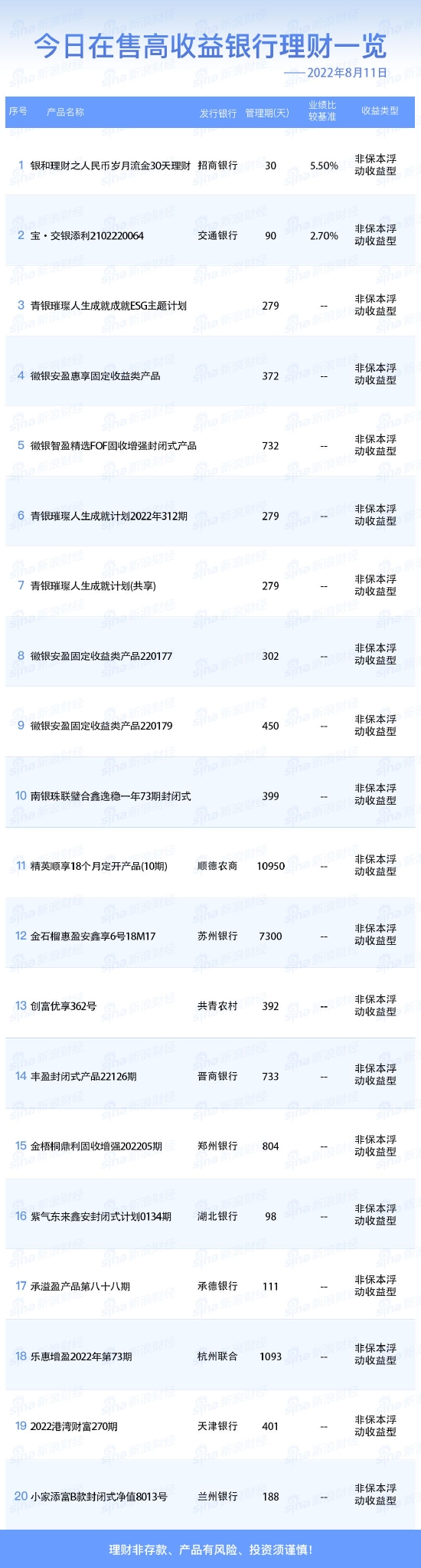 •   新浪财经8月11日在售高收益银行理财产品一览。今日业绩比较基准在2.70%及以上的银行人民币理财产品共2款。理财非存款、产品有风险、投资须谨慎!