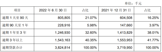 截至2022年6月30日,成都银行逾期贷款合计38.25亿元,上年末为37.20亿元;其中,逾期1天至90天贷款金额为8.06亿元,逾期90天至1年贷款金额为2.29亿元,逾期1年至3年贷款金额为12.47亿元,逾期 3 年以上贷款金额为15.43亿元。