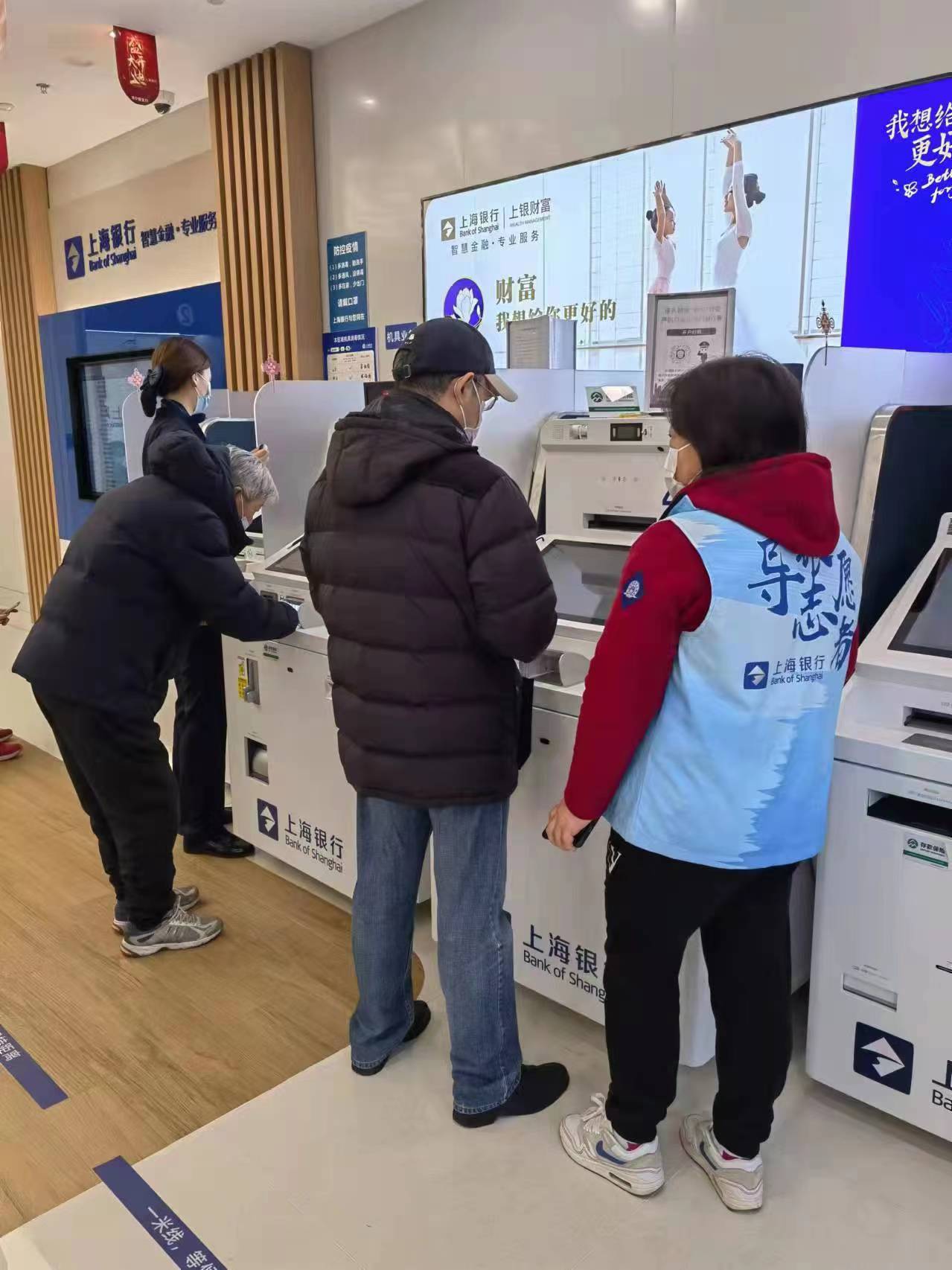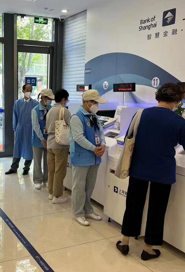 每到养老金发放高峰日,在上海银行网点中,总能看到一群身穿蓝马甲、胸挂蓝吊牌的老年导银志愿者,耐心细致,循循善诱地协助银行,指导同龄人使用各类金融智能化产品和服务。