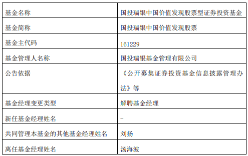 汤海波离任国投瑞银中国价值发现股票基金 年内亏25%