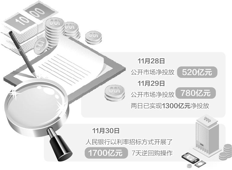 •   近日,中国人民银行逆回购操作力度逐渐加大,由上周的净回笼转变为本周的净投放。11月30日,人民银行以利率招标方式开展了1700亿元7天逆回购操作。29日,人民银行开展了800亿元逆回购操作,公开市场实现净投放780亿元,加上28日净投放的520亿元,两日已实现1300亿元净投放。