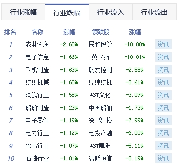行业板块方面,物流行业、房地产服务、商业百货、酒店旅游、化肥行业等涨幅居前,农牧饲渔、软件开发、半导体、计算机设备、航天航空等跌幅居前;题材方面,熊去氧胆酸、跨境电商、民爆、免税、户外露营等概念活跃。
