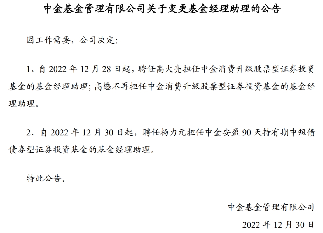•   中国经济网北京12月30日讯 今日,中金基金管理有限公司公告称,因工作需要,公司决定自2022年12月28日起,聘任高大亮担任中金消费升级股票(001193)的基金经理助理;高懋不再担任该基金的基金经理助理。同时,自2022年12月30日起,聘任杨力元担任中金安盈90天持有期中短债债券(A类016607;C类016608)的基金经理助理。