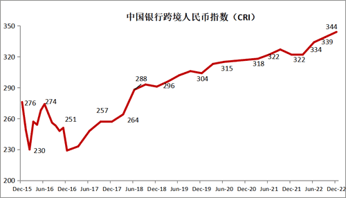 •        中国金融网讯   2月15日,中国银行发布2022年四季度跨境人民币指数(CRI)。结果显示,2022年四季度CRI指数为344,较上季度上升5点,超出预测值2点。