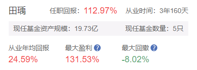 稳健似乎也是田瑀的主要风格,据爱基金网站的数据显示,田瑀的公募管理经验为3年多,从业以来的年均回报为24.59%,最大回撤仅为8.02%。