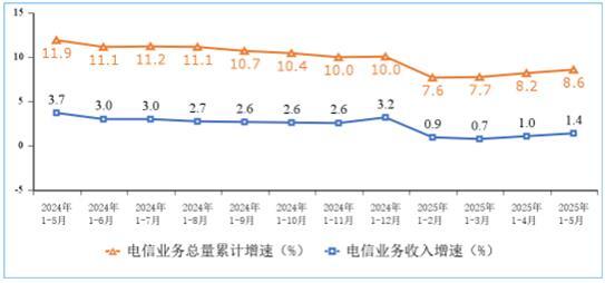 总体运行情况看,电信业务量收增速逐步提升。前5个月,电信业务收入累计完成7488亿元,同比增长1.4%。按照上年不变价计算的电信业务总量同比增长8.6%。