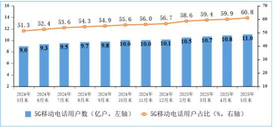 5G用户占比超六成。截至5月末,三家基础电信企业及中国广电的移动电话用户总数达18.07亿户,比上年末净增1699万户。其中,5G移动电话用户达10.98亿户,比上年末净增8414万户,占移动电话用户的60.8%。