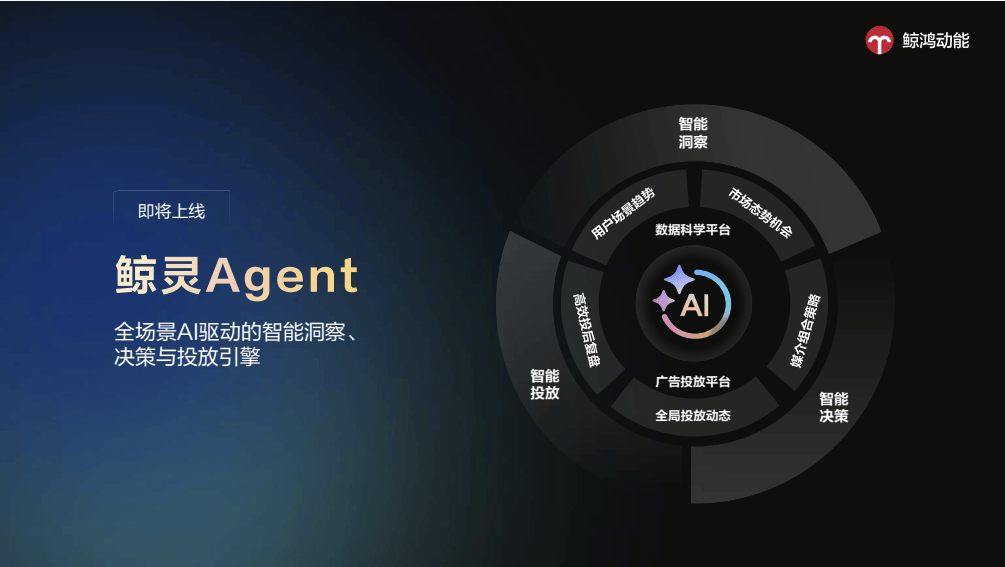 如果说“鲸鸿万象”解决了“看得清”的问题,那么即将推出的AI驱动智能决策引擎——“鲸灵Agent”,则致力于应对“投得准、投得好”的挑战。作为鲸鸿动能全场景AI能力的核心载体,“鲸灵Agent”深度融合数据科学与广告投放能力,构建“智能洞察、智能决策、智能投放”三大引擎,推动营销从经验驱动迈向AI自主决策。