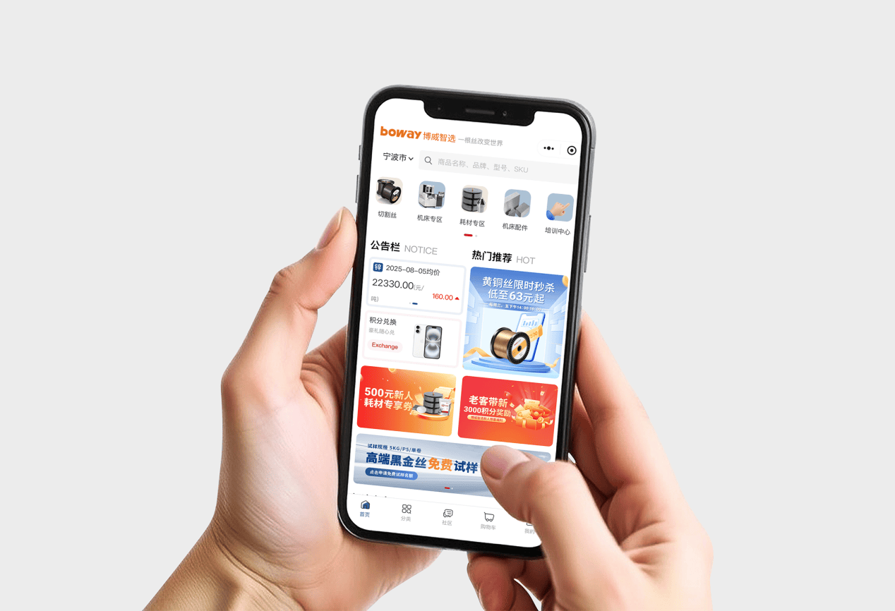 博威智选平台是一个专为精密制造行业打造的线上平台,涵盖了切割丝、机床、耗材、配件、维修保养、在线培训、行业资讯、社区交流等多项产品与服务,以卓越品质和优质服务,为客户提供高品质、一站式、全方位的工业品服务,为全球制造业高质量发展注入持续动力。