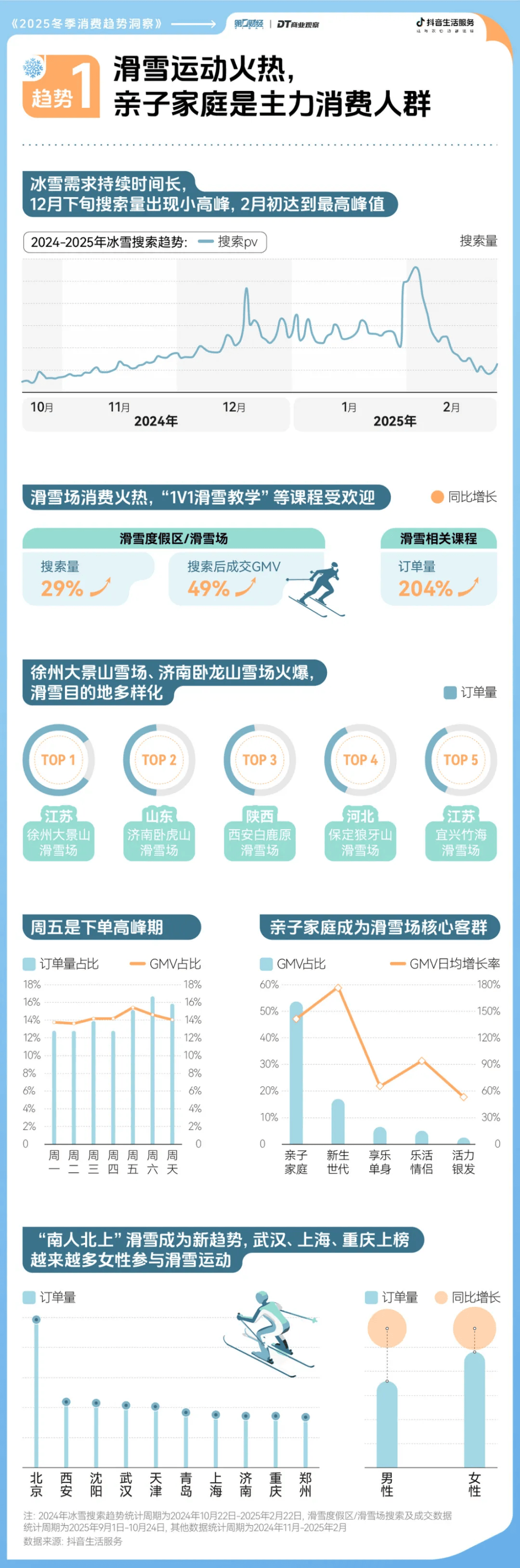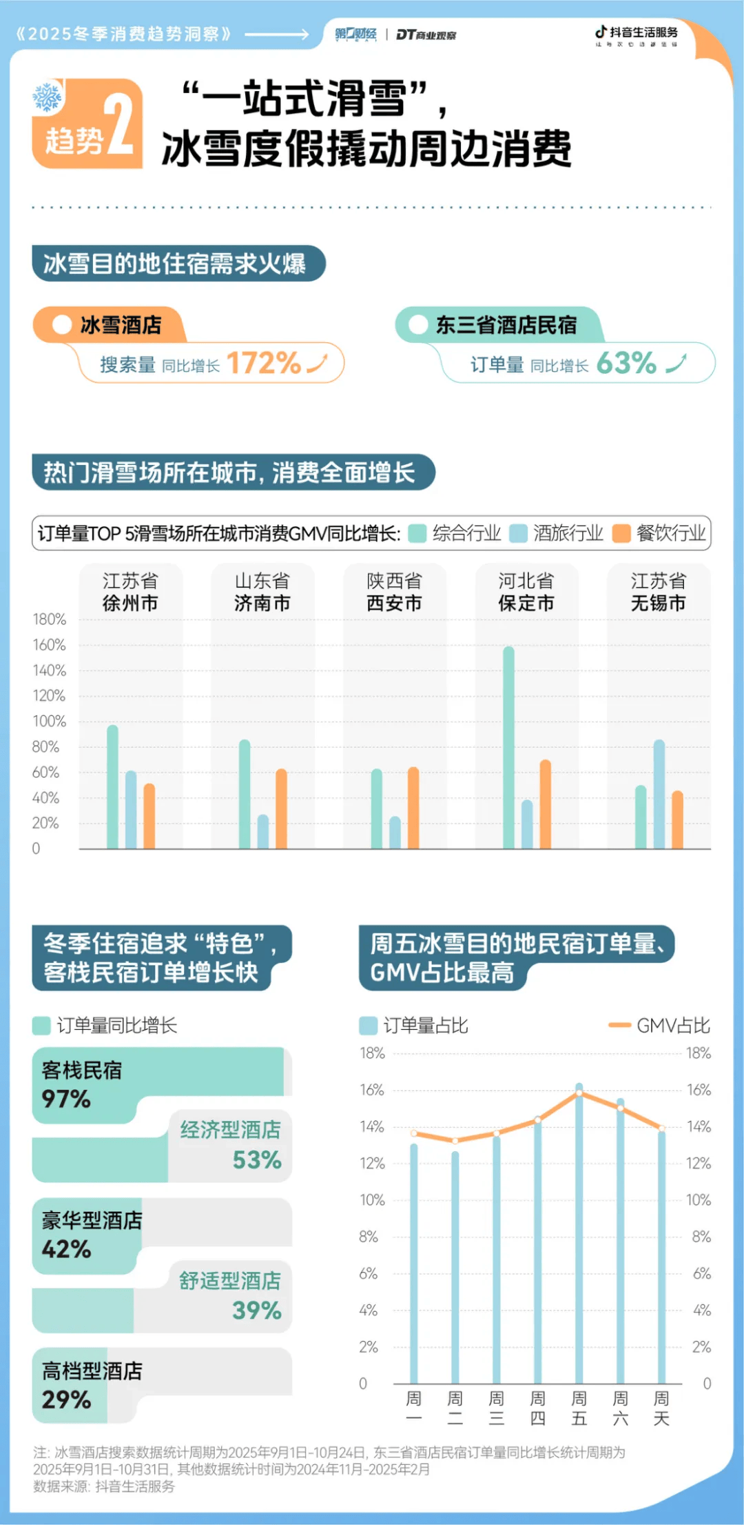今年9月到10月下旬,抖音上滑雪度假区/滑雪场搜索量同比增长29%,搜索后成交GMV同比增长49%。从数据看,内容种草到搜索、成交的链路更紧密,目的地型消费的转化效率明显提升。