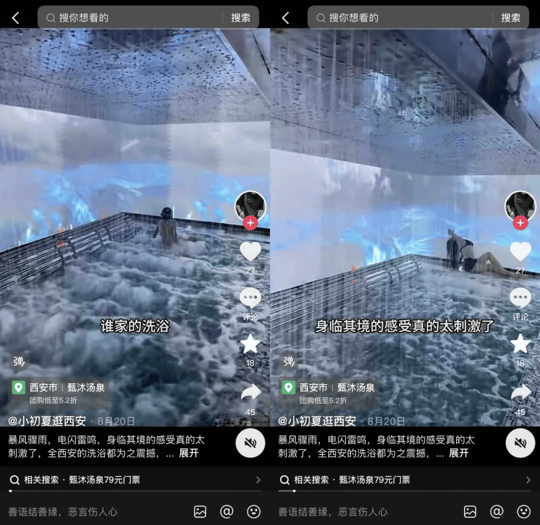 为了吸引消费者,洗浴中心还开始了花式整活,比如西安甄沐汤泉,设置了“暴风骤雨”打卡区,客人们换上泳衣踏入浅水区,在模拟的狂风暴雨氛围感中打卡出片。