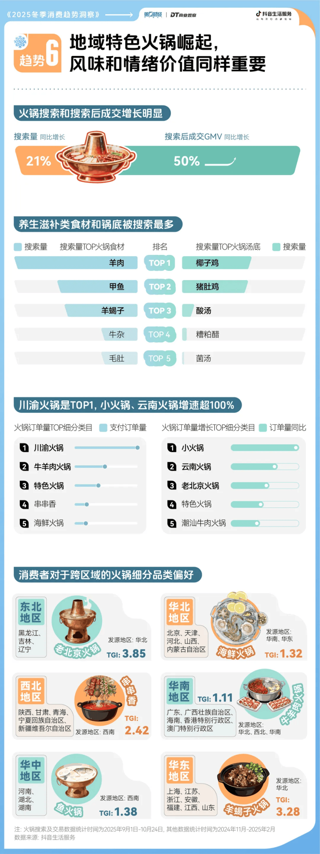 沸腾的锅底、现煮的锅气、围坐的人群,这种自带热闹感的美食,成为冬日餐桌的主角。抖音生活服务数据显示,火锅搜索量同比增长21%,搜索后成交GMV同比增长50%。