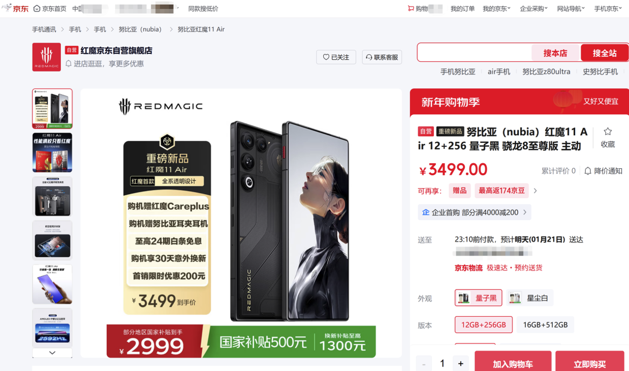 • 1月20日,红魔11 Air和红魔11 Pro+ GOLDEN SAGA臻金传奇正式发布,红魔11 Air首销价3499元起,红魔11 Pro+ GOLDEN SAGA臻金传奇售价9899元,现已开售。为带给消费者更多权益,京东携手红魔打造先人一步加速换新计划,北京、上海、广州、深圳、成都、武汉开启6城秒送,红魔11 Air最快半小时达。目前,京东已开售红魔11 Air,享国补到手价2999元起,还可享至高24期免息、30天意外换新、以旧换新至高补贴1300元、赠红魔Careplus、赠努比亚耳夹耳机等福利。同时,京东已开售红魔11 Pro+ GOLDEN SAGA臻金传奇,享尊享臻金VIP权益、赠臻金VIP-Careplus服务、京尊达套品配送、12期免息、晒图赠100元E卡等福利。