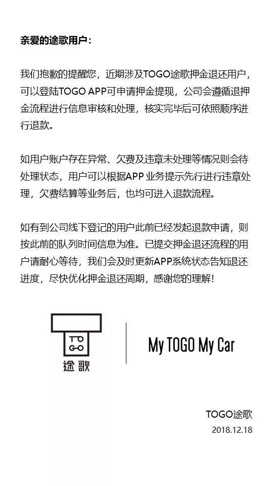 TOGO途歌在声明中表示,近期涉及TOGO途歌押金退还用户,可以登录TOGO APP可申请押金提现,公司会遵循退押金流程进行信息审核和处理,核实完毕后可依照顺序进行退款。