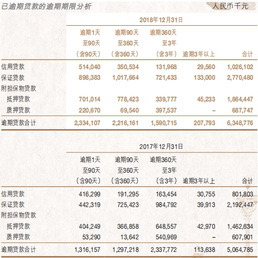 2018年,南京银行已逾期贷款合计为63.49亿元,上年同期为50.65亿元。其中,逾期1天至90天(含90天)合计为23.34亿元,逾期90天至360天(含360天)合计为22.16亿元,逾期360天至3年(含3年)合计为15.91亿元,逾期3年以上为2.08亿元。