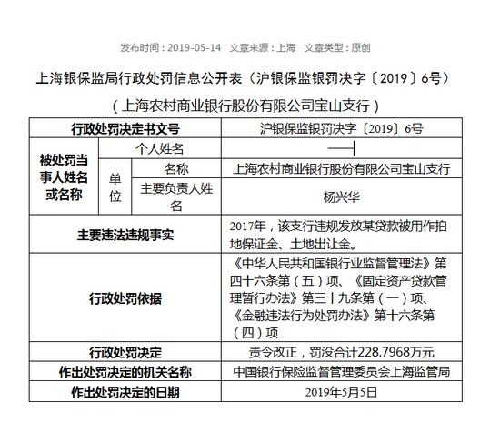 •      中国金融网5月15日讯 上海银保监局近日公布行政处罚信息公开表显示,上海农村商业银行股份有限公司宝山支行因违规发放某贷款被用作拍地保证金、土地出让金,被上海银保监局责令改正,并罚没合计228.7968万元,当事人黄河、杨兴华、朱宋杰被警告。