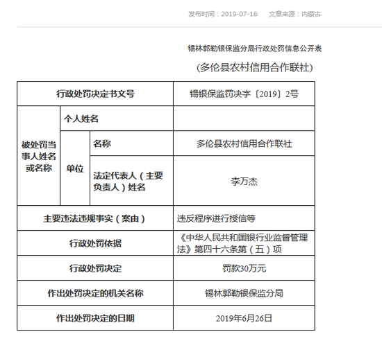 内蒙古阿尔山农商行相关责任人被罚6万元