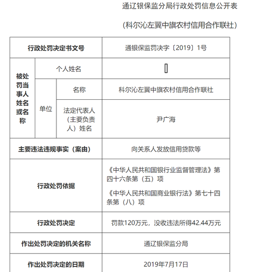 科尔沁区农村信用社一员工被罚款5万元