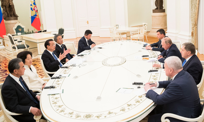 李克强首先转达习近平主席对普京总统的诚挚问候。李克强表示,中俄互为最大近邻,今年适逢两国建交70周年。前不久,两国元首一致同意将中俄关系提升为新时代全面战略协作伙伴关系。我此访同梅德韦杰夫举行中俄总理第二十四次定期会晤,全面规划两国各领域交往与合作,取得诸多新成果。中俄关系保持健康稳定发展,不仅有利于双方,有利于地区,也有利于世界。中方愿同俄方持续巩固友谊,深化合作,加强交往,维护以联合国为核心的国际体系和以世界贸易组织规则为基础的多边贸易体制,这对促进世界发展繁荣与和平稳定具有重要意义。