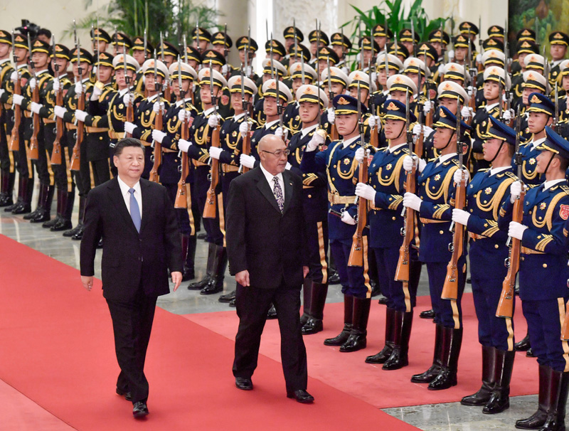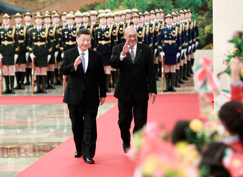11月27日,国家主席习近平在北京人民大会堂同苏里南总统鲍特瑟会谈。这是会谈前,习近平在人民大会堂北大厅为鲍特瑟举行欢迎仪式。新华社记者 庞兴雷 摄