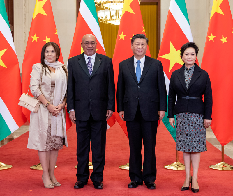 11月27日,国家主席习近平在北京人民大会堂同苏里南总统鲍特瑟会谈。这是习近平和夫人彭丽媛同鲍特瑟总统夫妇合影。新华社记者 李学仁 摄