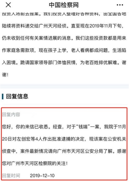 中国经济网北京12月11日讯 昨日,广州市天河区检察院于中国检察网回复钱端投资人称,“我院于11月20日对左创宏等4人作出批准逮捕的决定,现该案在公安机关侦查中,案件最新情况请向广州市天河区公安分局了解。”
