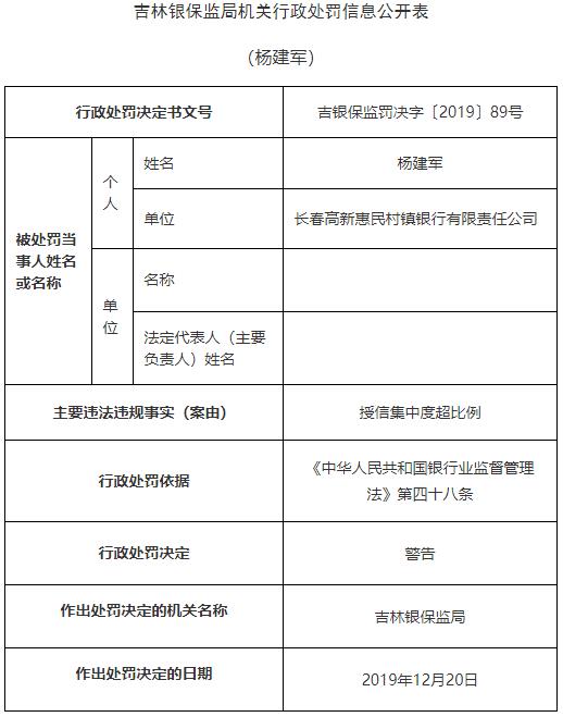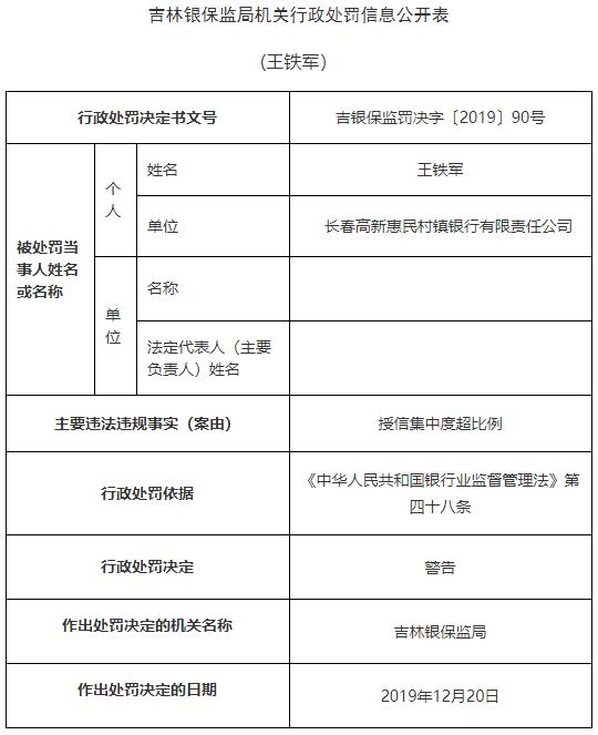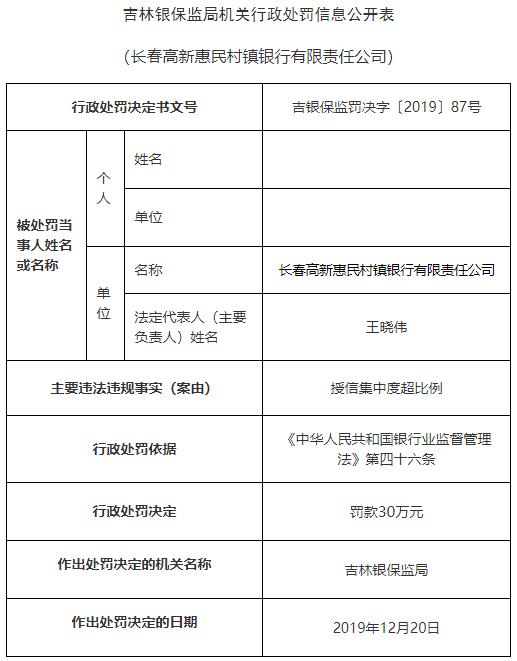 •   中国经济网北京12月25日讯 银保监会网站今日公布的吉林银保监局机关行政处罚信息公开表(吉银保监罚决字〔2019〕87号-90号)显示,长春高新惠民村镇银行有限责任公司存在授信集中度超比例的违法违规行为。根据《中华人民共和国银行业监督管理法》第四十六条,吉林银保监局对其处以罚款30万元。