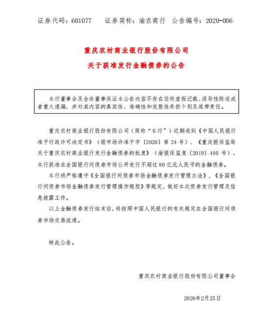 重庆农商行获准发行不超过80亿无固定期限资本债券