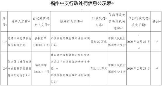 •   中国经济网北京3月6日讯 中国人民银行福州中心支行昨日公布的福州中支行政处罚信息公示表(福银罚字〔2020〕7号)显示,南靖中成村镇银行股份有限公司存在未按照规定履行客户身份识别义务的违法违规行为。中国人民银行福州中心支行对其处以罚款20万元。